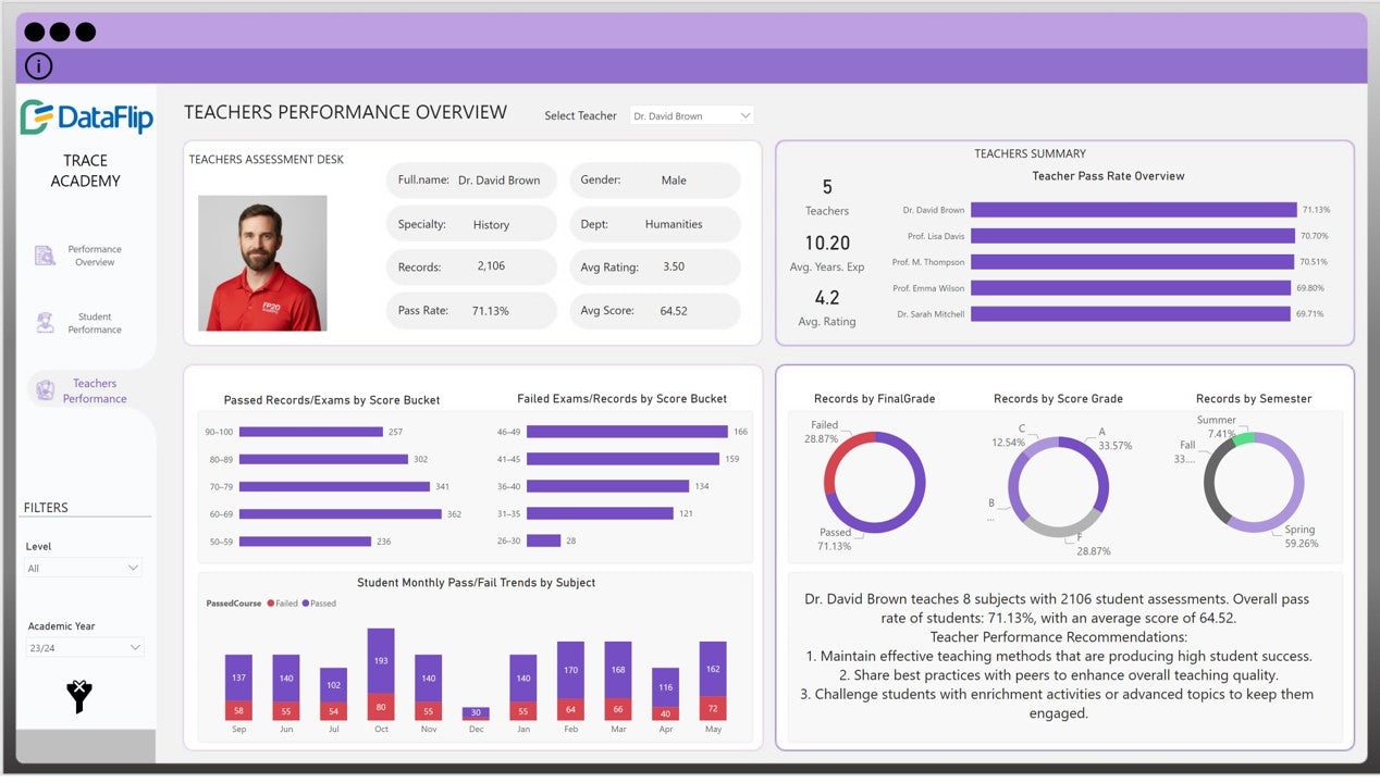This Power BI dashboard for student and teacher performance brings those stories together, test scores, and teaching records into ecosystems of measurable improvement.