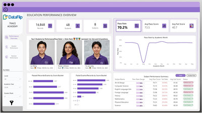 Track total records, students, and subjects with key KPIs like overall pass rate, average pass score, and fail score.