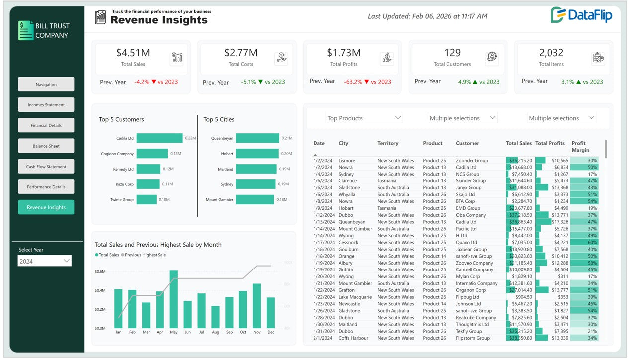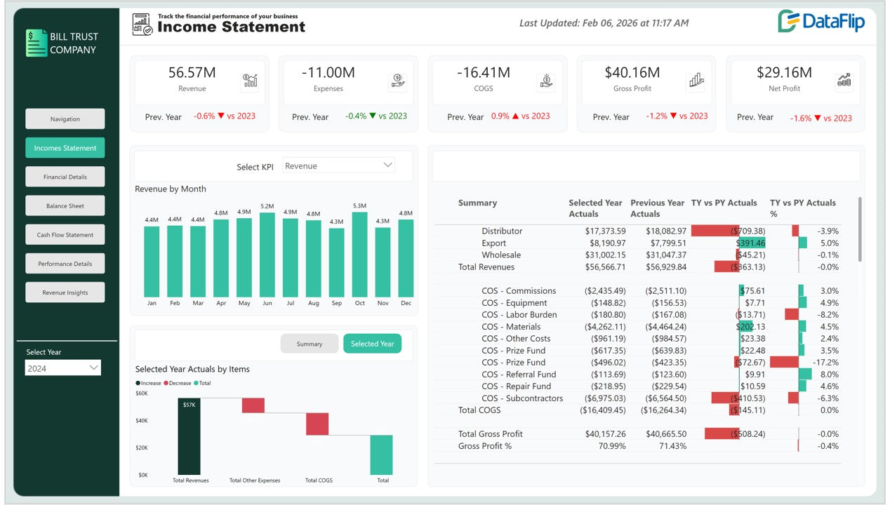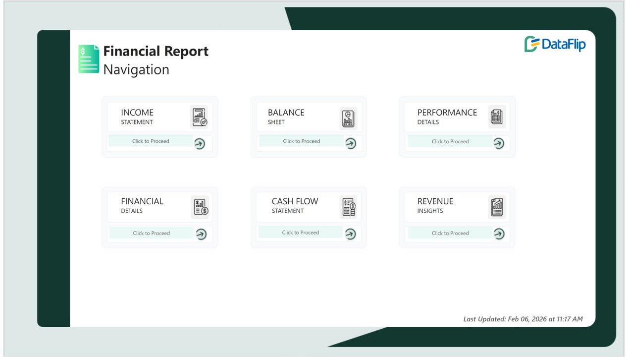 This Financial Performance Power BI Dashboard delivers a comprehensive executive-level view across six interconnected pages: Income Statement, Financial Details, Balance Sheet, Cash Flow Statement, Performance Details, and Revenue Insights.