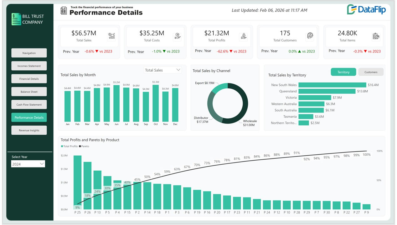 Performance Details highlight total sales, total costs, total profits, total customers, and total items, while showing sales by channel, territory, and product-level Pareto analysis to identify high-impact contributors.