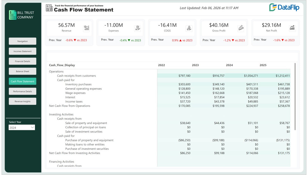 The Cash Flow Statement shows how much cash is generated annually through operating, investing, and financing activities, providing clear visibility into overall liquidity movement.