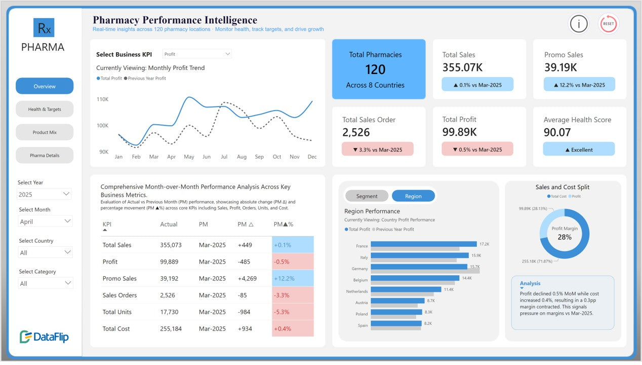 The Pharmacy Performance Analysis Power BI Dashboard Template turns complex pharmacy operations into a single executive intelligence system. It unifies pharmacy sales analytics, profit performance, cost monitoring, and pharmacy health scores into one interactive command center.