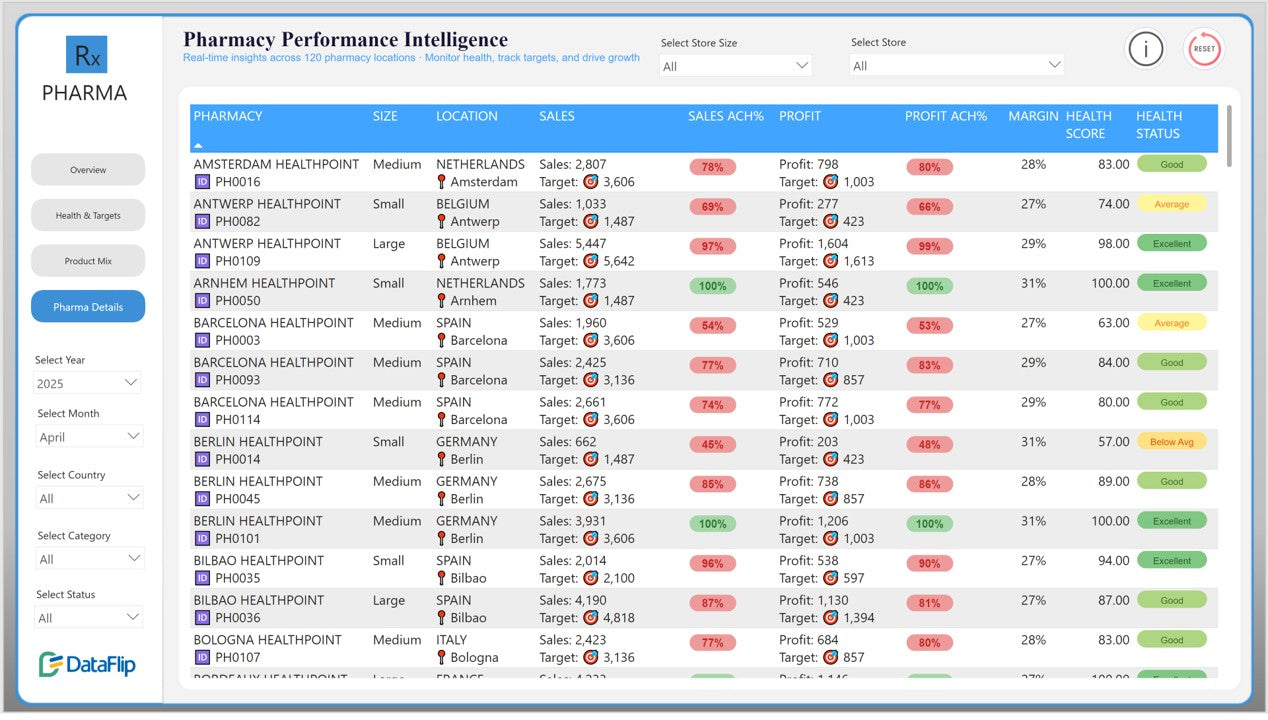 Pharmacy performance goes beyond revenue numbers. Operational health, target achievement, and store-level performance are equally critical.