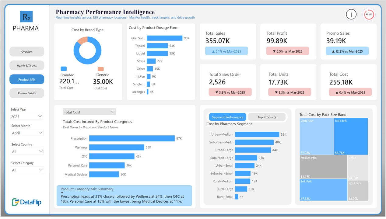 The product mix analysis reveals category contribution across prescription products, wellness items, OTC products, personal care, and medical devices, helping organizations optimize product strategy.